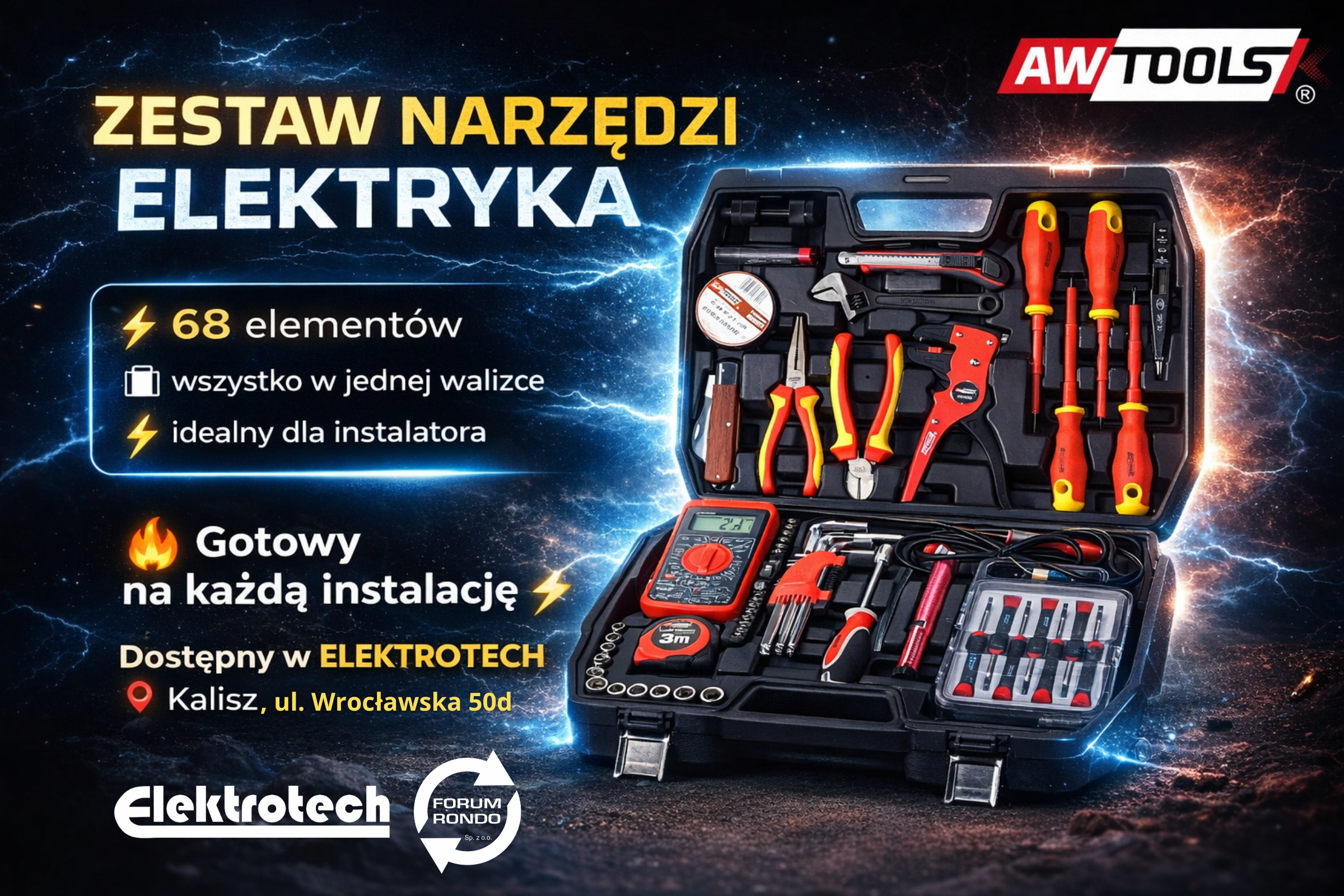 Zestaw AWTOOLS - 68 elementów dla elektryków pozwala pracować wygodnie bez szukania potrzebnych narzędzi.